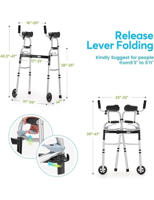 Equipped with 5-inch wheels for easy rolling, this folding walker provides stable mobility assistance, comfortably supporting users up to 300 lbs. It offers a secure, comfortable, and highly adjustable solution for short-term rehabilitation or daily use.